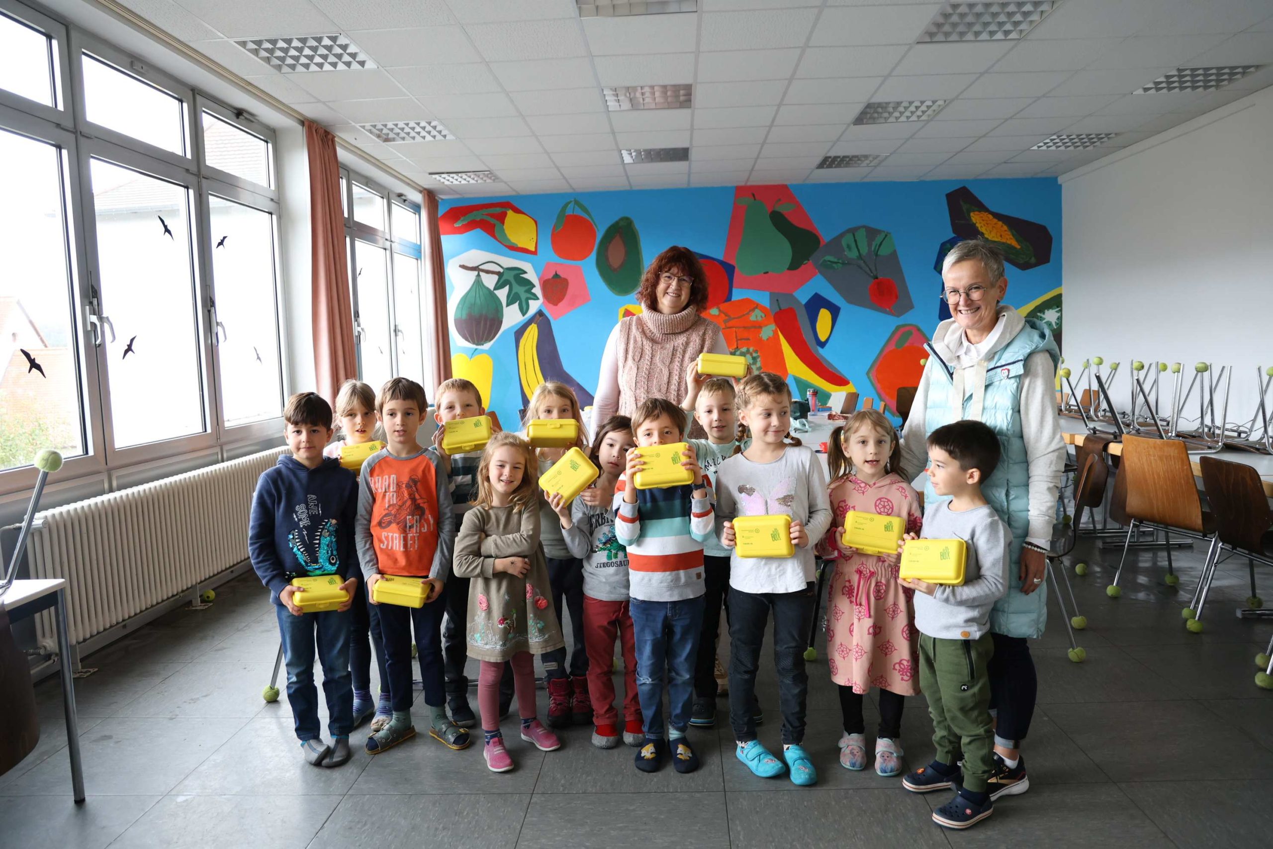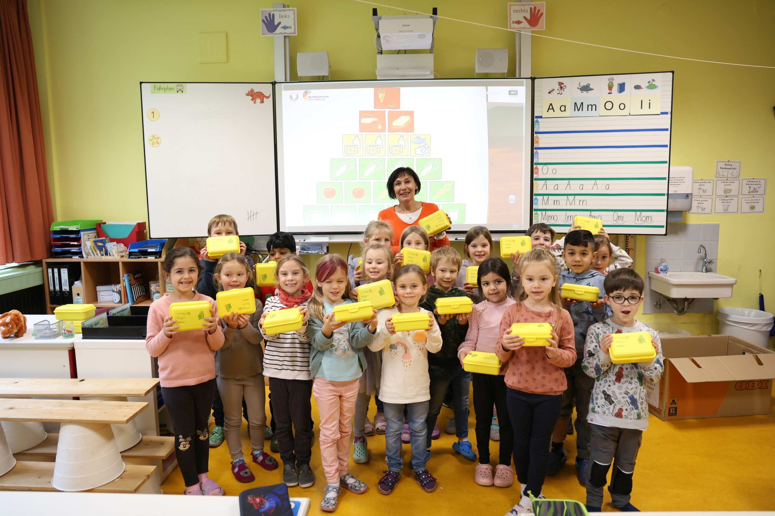Voller Vorfreude packten die Kinder ihre gelben Brotboxen aus, die von der Kreisparkasse Saarpfalz und der Sparkasse Saarbrücken gesponsert werden und zur täglichen Nutzung gedacht sind.