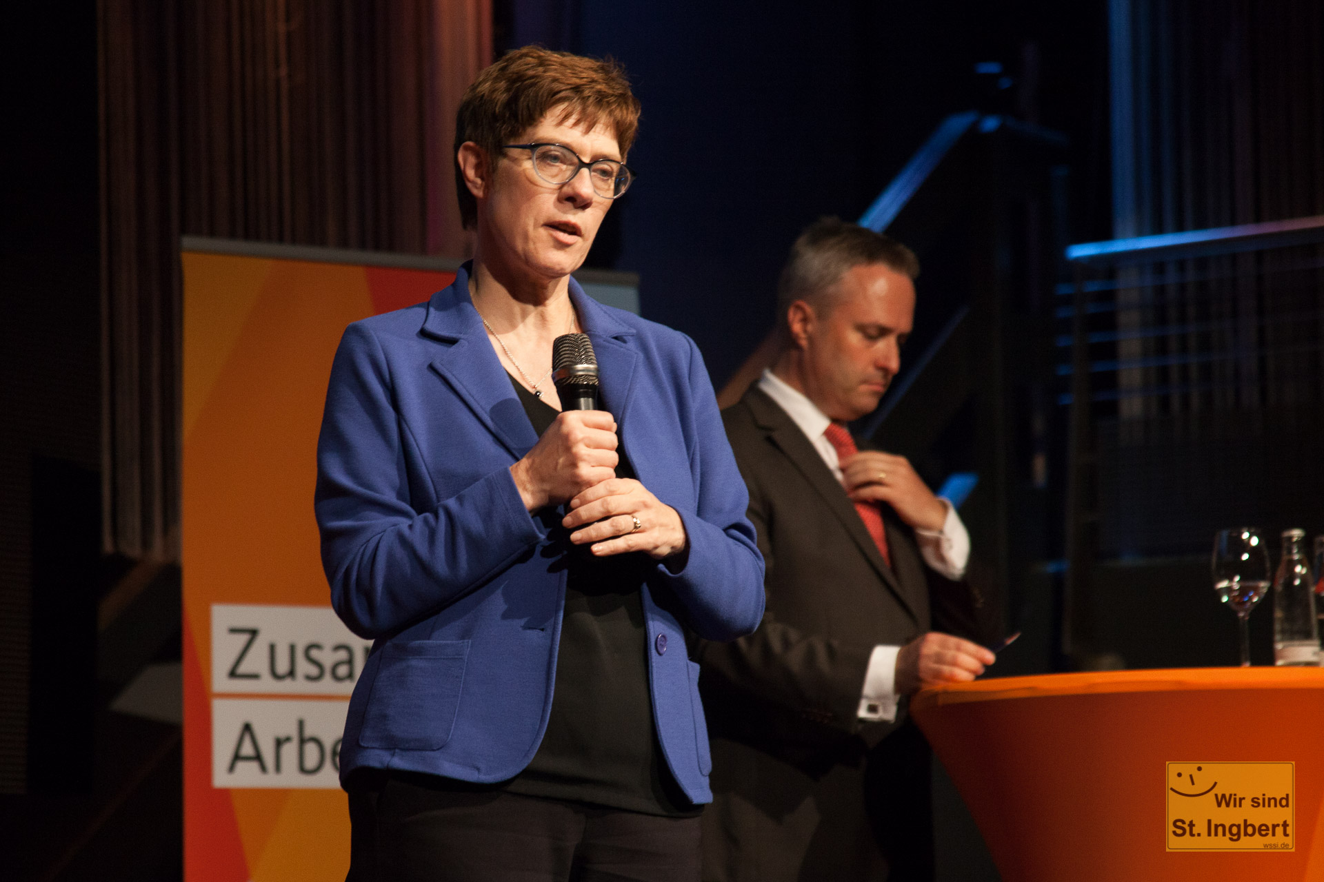 Foto: Frank Leyendecker CDU-Chefin Annegret Kramp-Karrenbauer und OB-Kandidat Prof. Ulli Meyer betreten die Bühne.Um den CDU-Spitzenkandidaten für die Oberbürgermeisterwahl Prof. Dr. Ulli Meyer zu unterstützen und Wähler zu mobilisieren kam CDU-Chefin Annegret Kramp-Karrenbauer nach St. Ingbert ins Eventhaus. Zu der Veranstaltung kamen zahlreiche Gäste aus Politik und Wirtschaft.