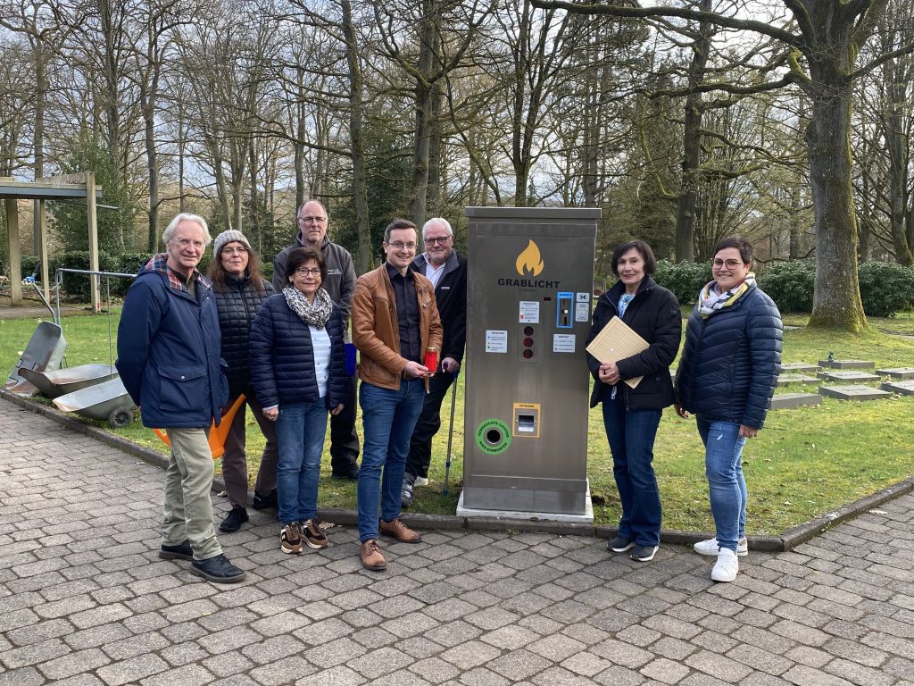 Zu Beginn des Rundgangs wurde der Kommission ein Muster der neuen orangefarbenen Gießkannen, die vom Ortsrat finanziert wurden, präsentiert. Sie tragen den Aufdruck „Ortsrat St. Ingbert-Mitte“ und sollen in einer Anzahl von 60 Stück schon in wenigen Wochen den Friedhofsbesuchern zur Verfügung stehen. Ein erster Besichtigungspunkt war der neu installierte Grablichtautomat. Friedhofsmeister de Groot erläuterte das Konzept: „Solche Automaten gibt es inzwischen über 600mal in Deutschland. Die Grablichter zum Preis von 3 Euro haben eine Brenndauer von rund 50 Stunden und sind nachhaltig produziert.“ Man sei gespannt, inwiefern das neue Angebot von der Bevölkerung angenommen werde. Auch infrastrukturelle Maßnahmen wurden angesprochen. So sollen sowohl auf dem Alten Friedhof als auch auf dem Waldfriedhof Fundamente für transportable Fahnenmasten errichtet werden. Die Kommission sprach sich für den Vorschlag des Friedhofsmeisters aus, diese im Eingangsbereich der Leichenhallen zu platzieren, um bei würdigen Anlässen eine entsprechende Beflaggung zu ermöglichen.