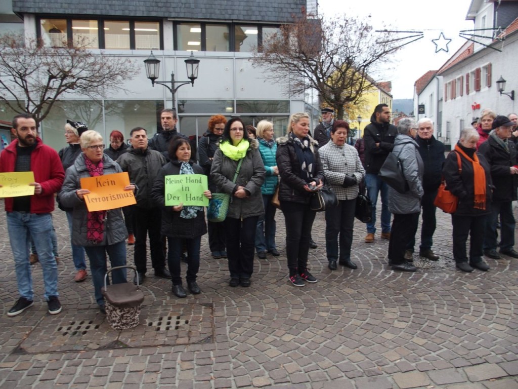Plakate mit Aufschriften wie „Terror hat keine Religion“ oder „Wir distanzieren uns, vor dem Terror der IS“ hielten die Teilnehmer in den Händen. Ein Syrischer Flüchtling zupfte mitfühlend an den Saiten seiner Gitarre und Kerzen wurden aufgestellt und entzündet. Mehr als 100 Flüchtlinge und Einheimische waren gekommen, um ihre Solidarität zu den Anschlägen in Paris über die Stadtgrenzen hinaus zu tragen. Wegen dem Terror der IS haben sie ihre Heimat verlassen und haben bei uns Schutz gesucht. Oberbürgermeister Hans Wagner, war wie viele der ehrenamtlichen Helferinnen und Helfer von dieser Aktion der Flüchtlinge gerührt.