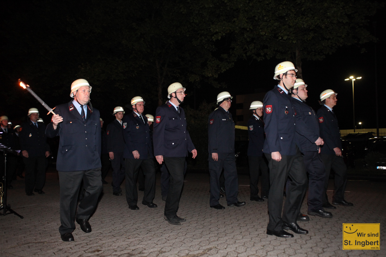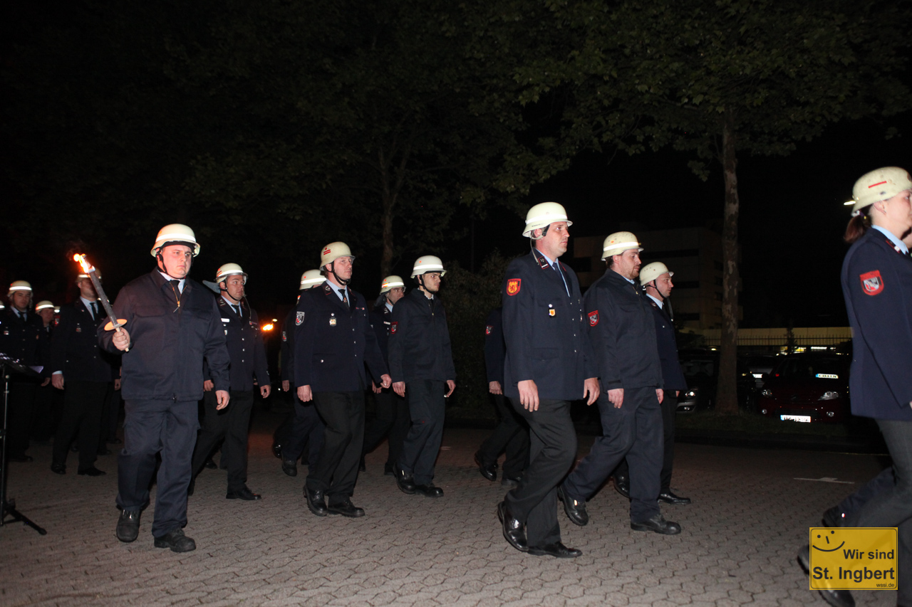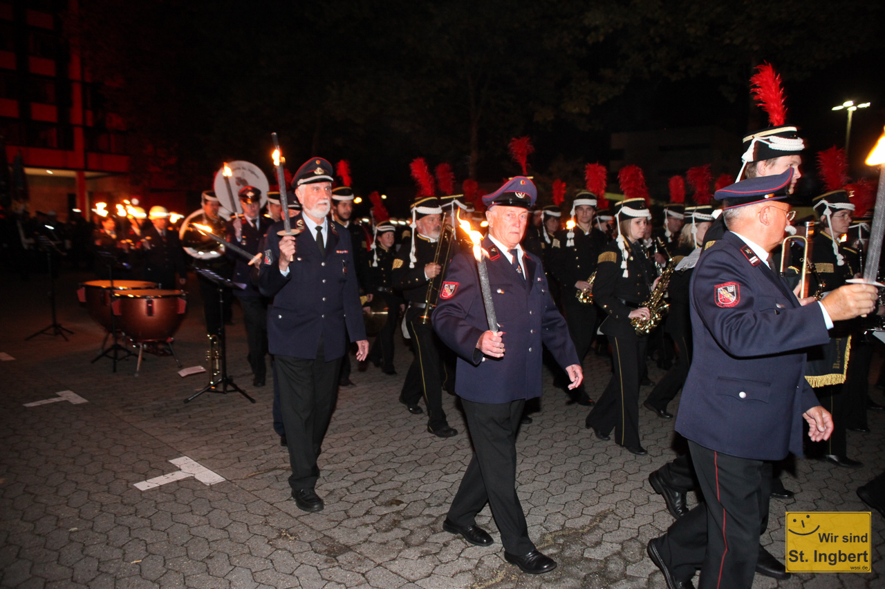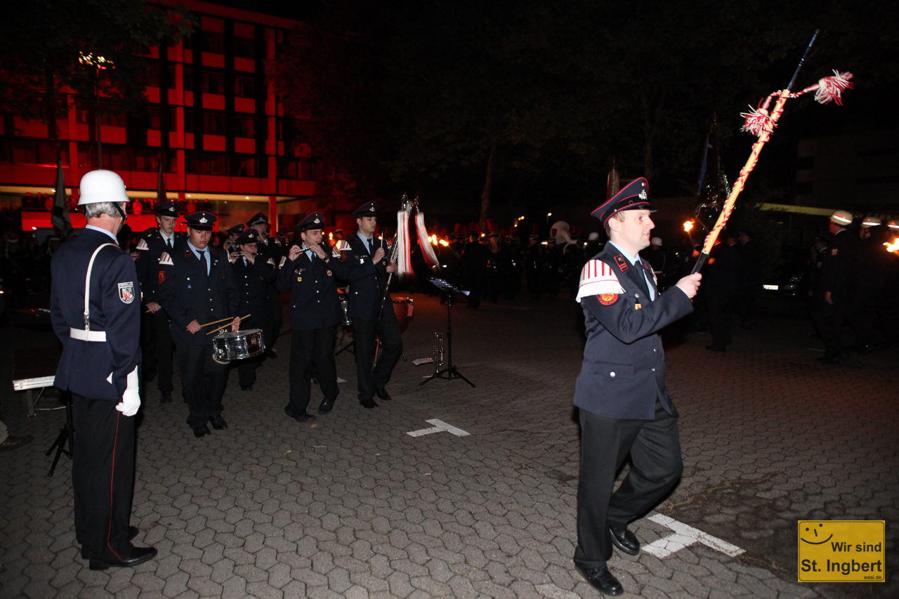 Die St. Ingberter Feuerwehr bot in den letzten Wochen mit Schauübungen und Ausstellungen Einblick in ihr 150-jähriges Wirken. Zum großen Abschluß am Wochenende kam Saarlands Ministerpräsidentin Annegret Kramp-Karrenbauer und Landrat Clemens Lindemann in das Feuerwehrgerätehaus nach St. Ingbert und würdigte die vielen Helfer. Am vergangenen Wochenende stand dann Feiern auf dem Programm: Schaafa Sämpf und die Büddenbacher rockten das Haus. Am Sonntagabend fand der große Zapfenstreich statt. Die Feuerwehr St. Ingbert, die Bergkapelle St. Ingbert und der Spielmannszug der Feuerwehr Elversberg marschierten vom Grubenweg auf den Platz neben dem Rathaus und der Feuerwehr.