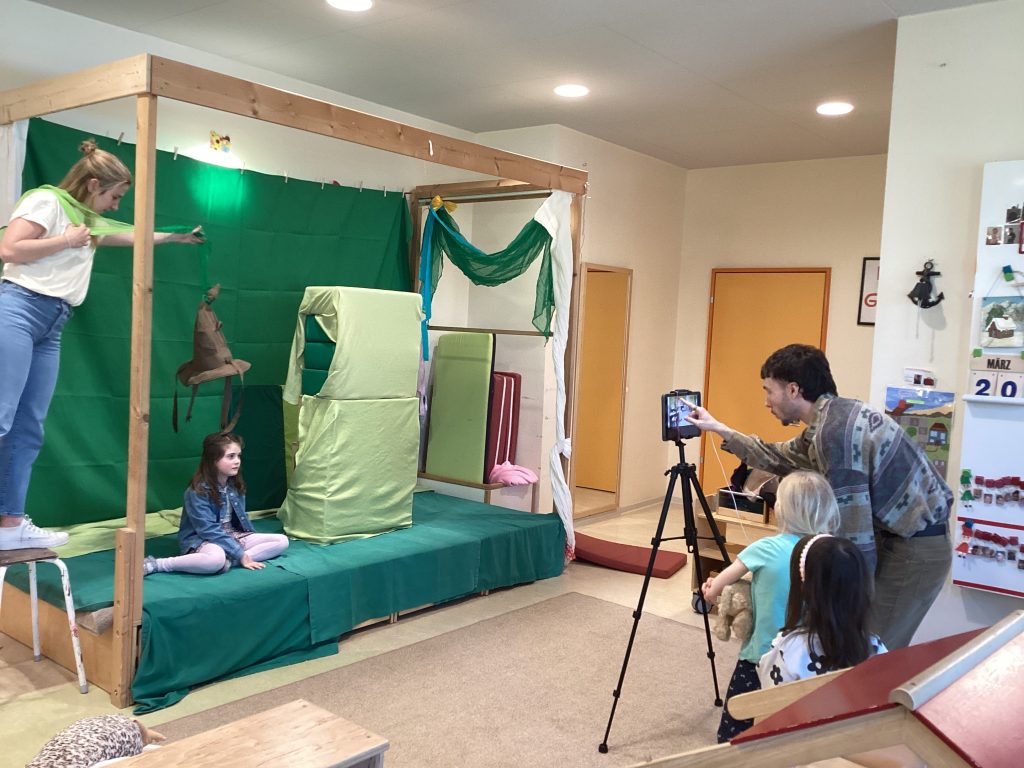 Unter dem Motto „von Klein zu Groß“ begann der Workshop zunächst im Mini-Format. In einer kleinen Greenscreen-Box produzierten die Kinder erste kurze Filme und lernten dabei die Grundlagen der Filmtechnik kennen. Im nächsten Schritt wurden die Kinder selbst zu Schauspielerinnen und Schauspielern auf der Bühne und entwickelten eigene Szenen, die sie ganz nach ihren Vorstellungen umsetzten. So entstanden Kurzfilme, bei denen der Kreativität keine Grenzen gesetzt waren.