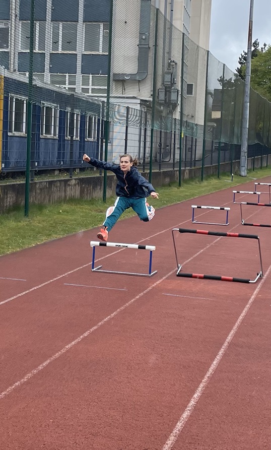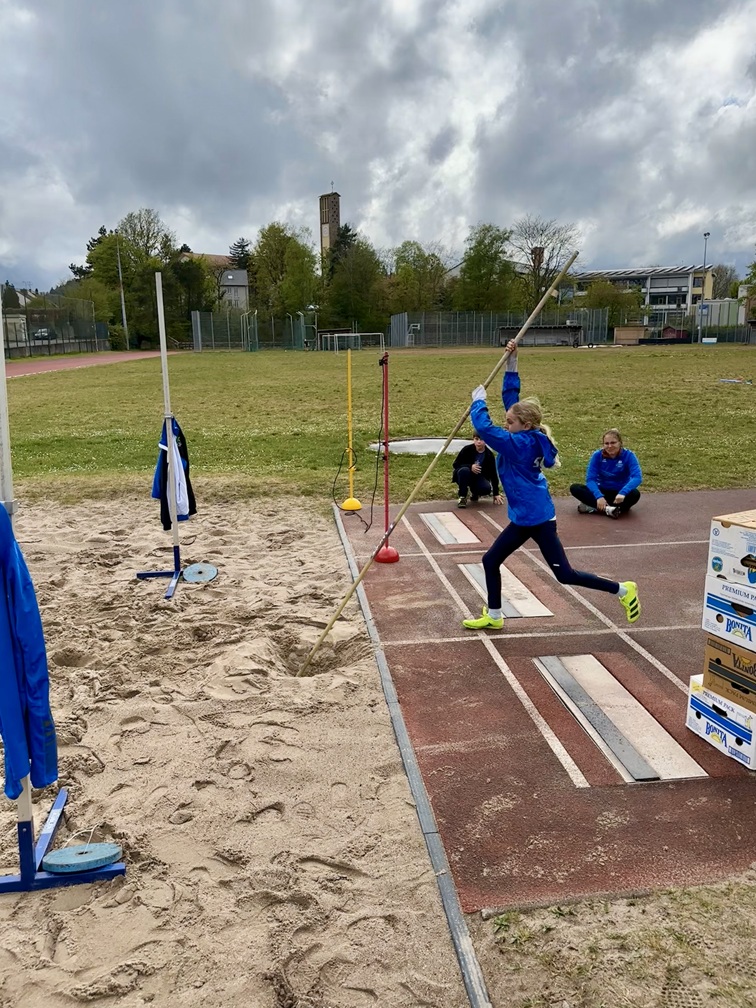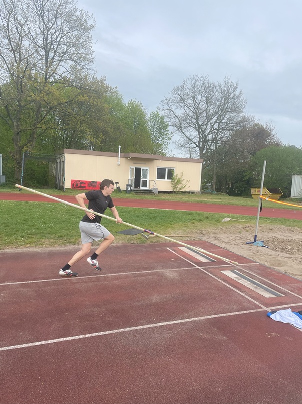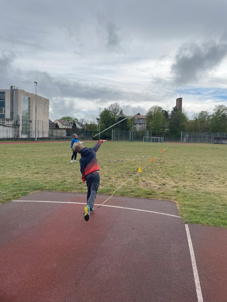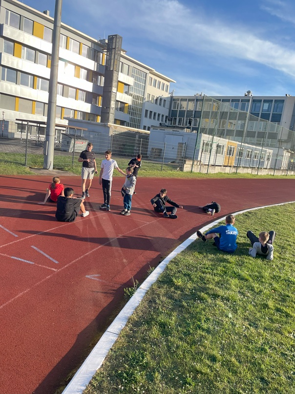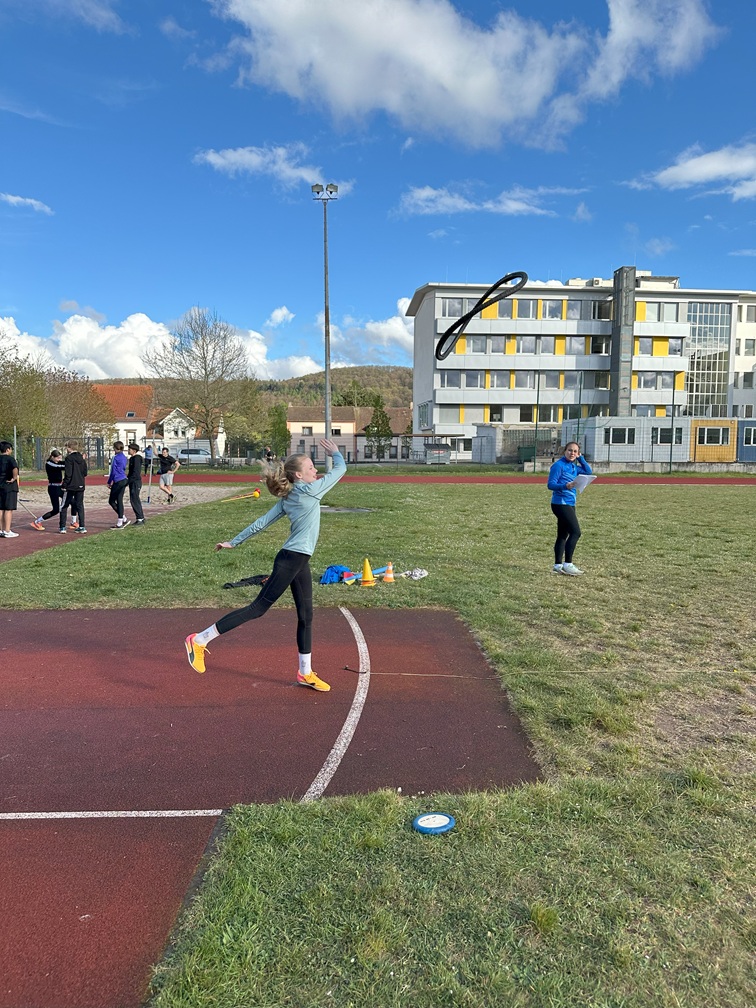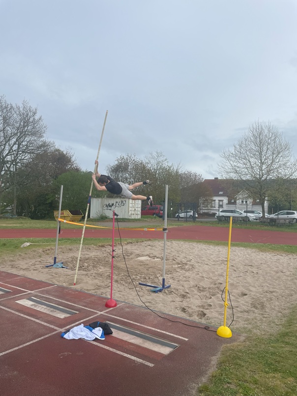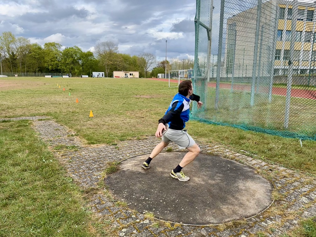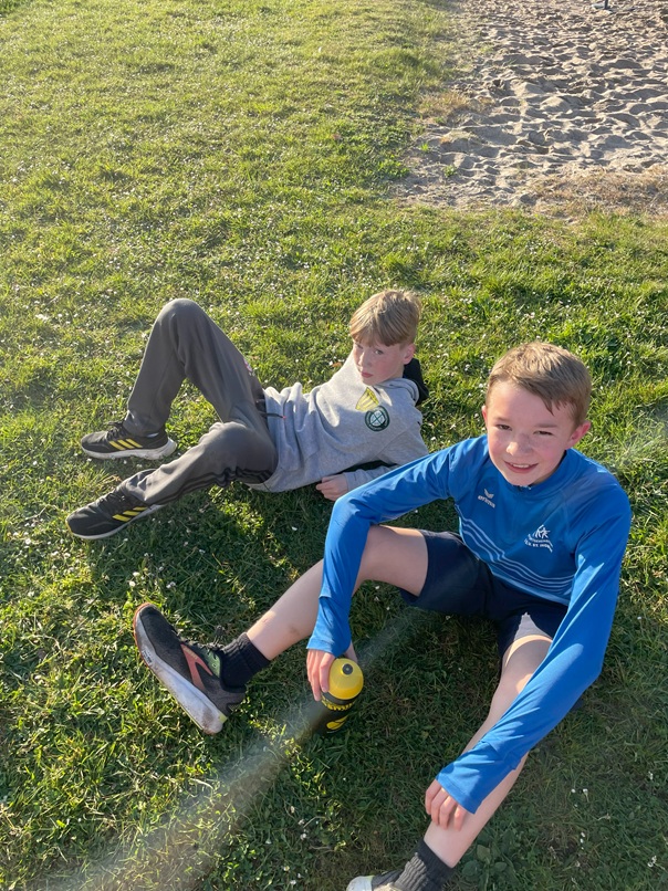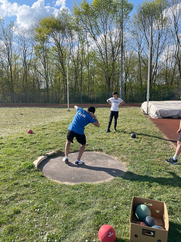Gestärkt trat man den Weg zum Finaltag des zweitätigen Zehnkampfes an, welcher nicht nur von den jungen Athletinnen und Athleten sondern auch vom Trainerteam mit Ehrfurcht erwartet wurde (denn die „Alten“ konnten es sich selbstverständlich auch nicht nehmen lassen, den Wettkampfmodus zu bestreiten). Der zweite Wettkampftag begann mit dem Hürdenlauf, welcher für die Jüngeren mit einem Sprint über Bananenkisten modifiziert wurde. Nicht nur hierbei wuchsen einige Athleten über sich hinaus und legten überraschend gute Zeiten auf die Bahn. Als nächstes standen der Diskuswurf sowie der technisch anspruchsvolle Stabhochsprung auf dem Plan. Da beides erst ab 16 Jahren im Wettkampfprogramm steht und es für Viele das erste Mal war, wurde man auch hier einfallsreich. Anstatt runden Wurfscheiben aus Metall wurden teilweise Gummireifen genutzt, die allerdings genauso weit geschleudert werden konnten wie die richtigen Wurfgeräte. Der Rest stellte sich nach kurzer Einführung mit Trockenübungen (selbstverständlich übernommen durch Altmeister Manfred) ebenfalls äußerst geschickt an und entdeckte ungeahntes Wurftalent. Für den Stabhochsprung wurde die Weitsprunggrube kurzerhand umfunktioniert und eine Schnur zum Drüberspringen gespannt, was bei den Meisten auf Begeisterung stieß. Im Anschluss wurde noch Speer geworfen, ehe der abschließende 800m-Lauf anstand. Über zwei Stadionrunden hauten die Athleten/innen nochmals alles raus, was sie an Energiereserven übrig hatten.