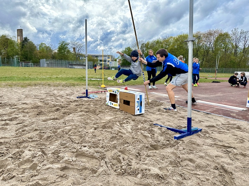 Zunächst stand ein kurzes Warmup, von Altmeister Kohler höchst persönlich inszeniert, an. Dann wurden auch schon Spikes angezogen und das Wettkampfszenario kurz erklärt. Viele der Sportler im Alter zwischen 9 und 15 Jahren hatten zuvor noch nie so viele verschiedene Disziplinen in solch kurzer Zeit absolviert, woran man bereits merkt, dass es nicht nur körperlich höchst herausfordernd ist. Es stand der erste Tag des 10-Kampfes (in altersgerechter Form mit leicht abgewandelten Disziplinen) an, welcher traditionell mit dem Sprint beginnt. Spätestens jetzt war jeder hellwach und im Wettkampfmodus, sodass es in zwei Gruppen mit dem Kugel-/Medizinballstoßen und dem Hochsprung weiterging. Im Anschluss stand der Weitsprung für alle auf dem Plan, ehe es zum berüchtigten (und oft verhassten) Langsprint ging. Da in diesem Alter auch bei Einzelwettkämpfen noch keine 400 Meter gerannt werden, entschied man sich für einen Pendelsprint mit einer Gesamtlänge von immerhin 250 Metern… und JA es ist genauso anstrengend wie es sich anhört!