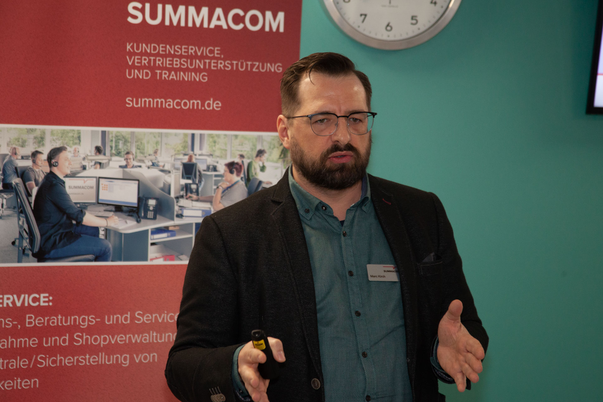 Marc Kirch, Leiter für Marketing und Vertrieb des Gastgebers „Summacom“ freute sich über die zahlreichen Gäste und erwähnte zuerst das angebotene Wasser, das einen Guten Zweck erfüllt und deren Einnahmen für Wasserprojekte in Afrika verwendet werden. Er stellte das Unternehmen vor, das schon seit 1997 existiert und auf mittlerweile 450 Mitarbeiter angewachsen ist.